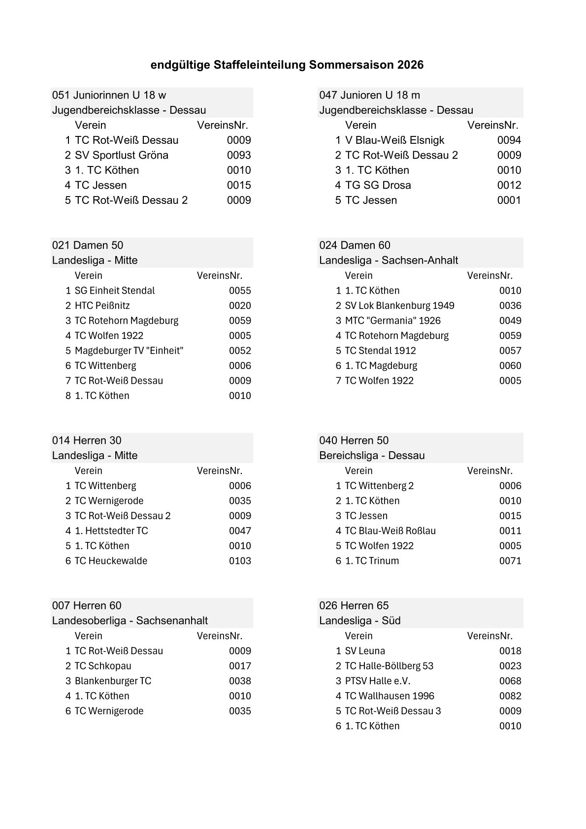 Für die Sommersaison 2026 hat der 1. TC Köthen 8 Mannschaften gemeldet. Die endgültige Staffeleinteilung wurde durch den Tennisverband Sachsen-Anhalt veröffentlicht.