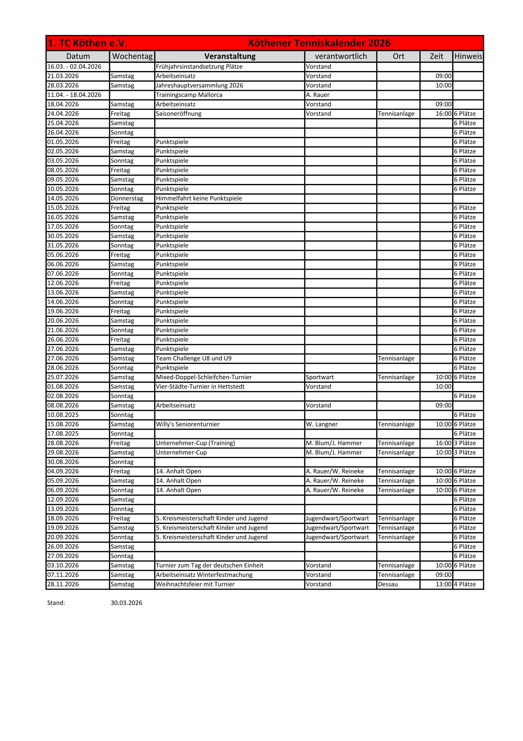Am 28. März 2026 fand die turnusmäßige Jahreshauptversammlung des 1. TC Köthen, auf der auch die Wahl eines neuen Vorstands auf der Tagesordnung stand.